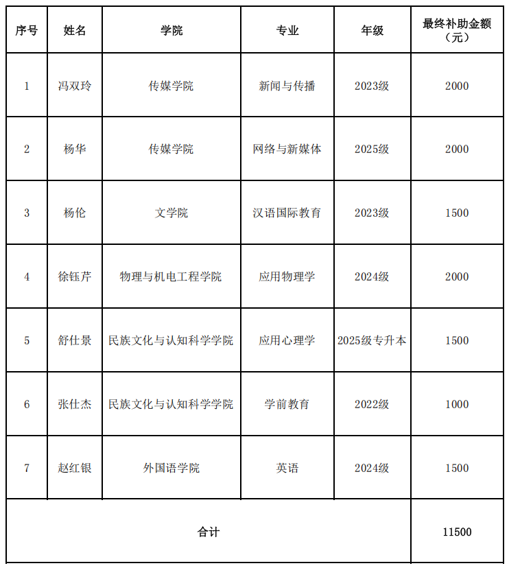 根据《贵州民族大学家庭经济困难学生资助管理规定》,经学生申报,学院初审,学生资助管理中心于2025年12月16日会议研究讨论,拟给予冯双玲等7名学生临时困难补助。名单如下: