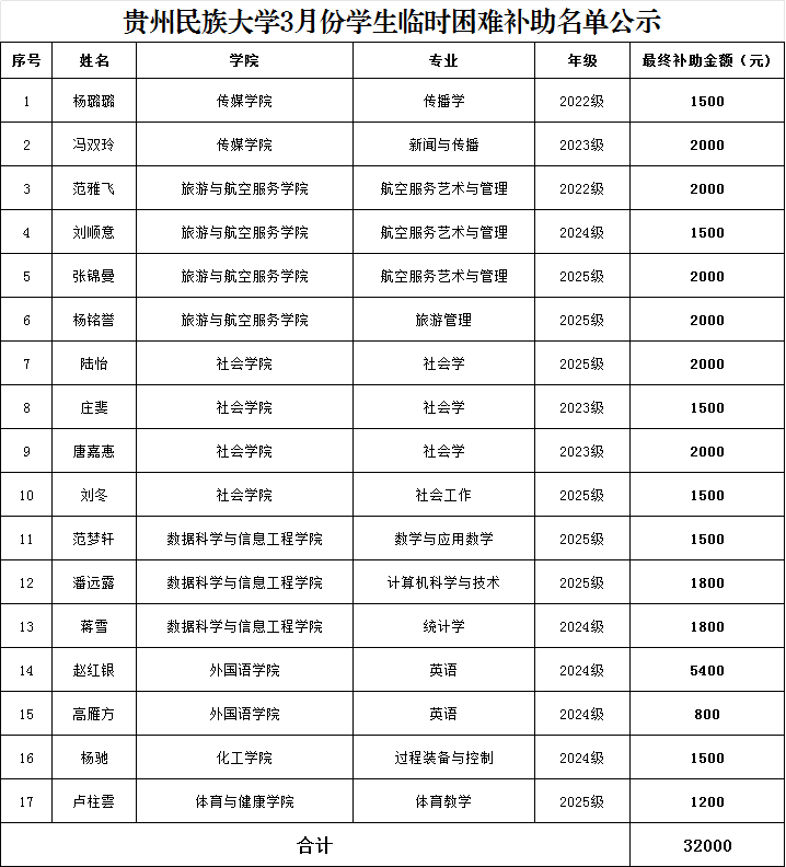 根据《贵州民族大学家庭经济困难学生资助管理规定》,经学生申报,学院初审,学生资助管理中心于2026年4月1日会议研究讨论,拟给予杨璐璐等17名学生临时困难补助。名单如下: